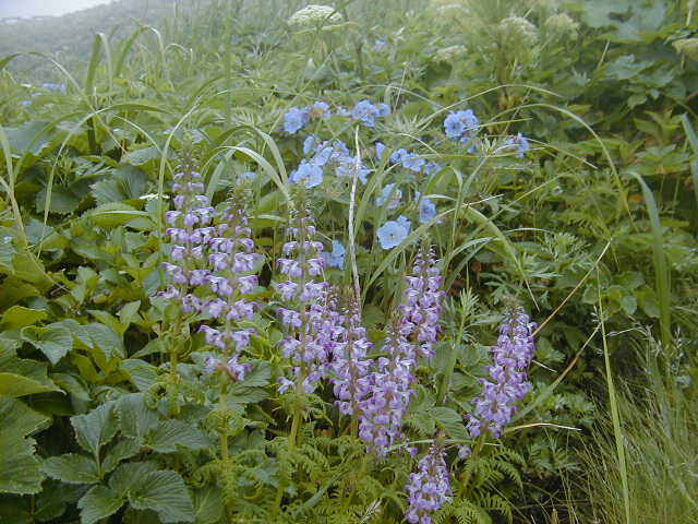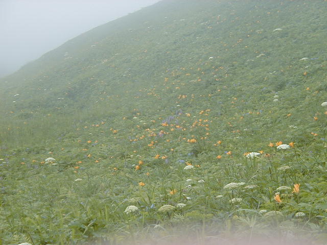 岬へ行く道の回りに花が咲いていてとても綺麗で、霧が出ていた所為もあるが岬自体