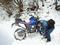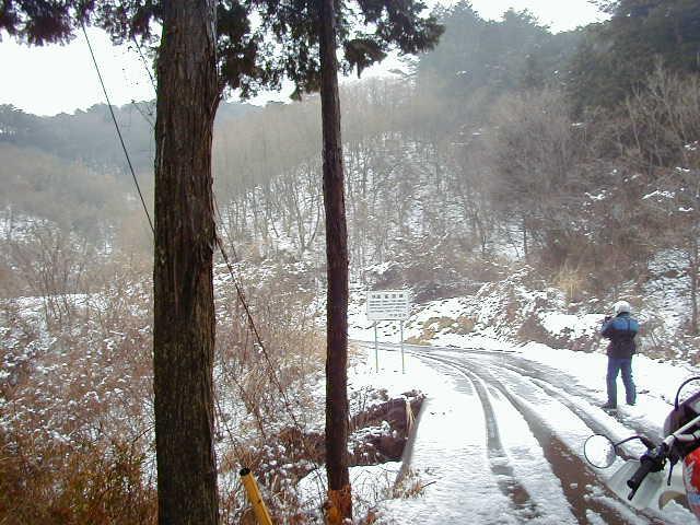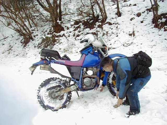 場所によっては融け始めた雪で道が泥々、バイクも