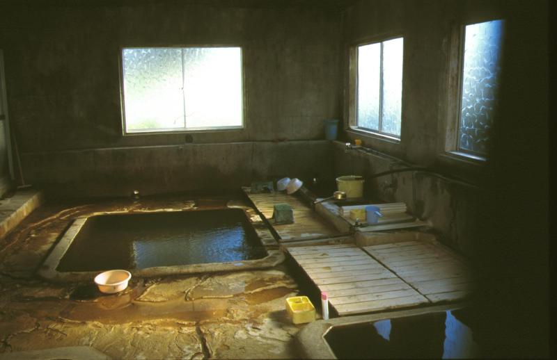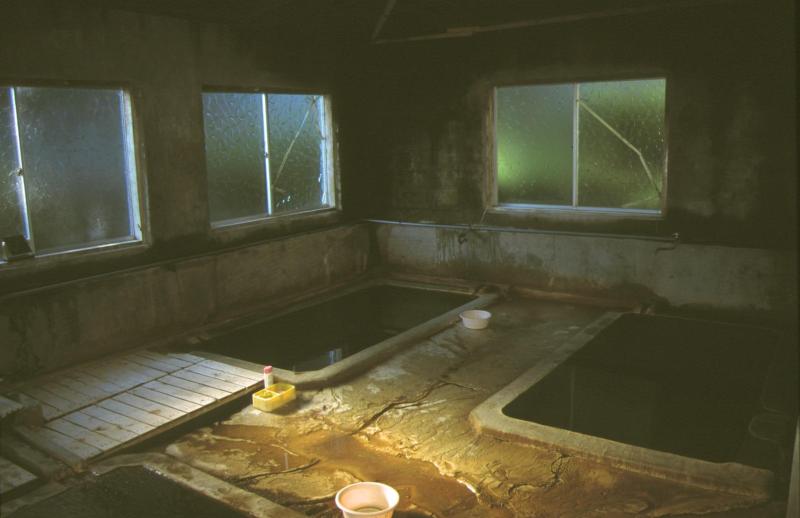 一瞬普通の民家に見えるが、よく見ると右側に宿名が書かれた支柱がある。 玄関を開けると、これまた民家と間違える様な雰囲気だ。 入浴料を支払い、上がって左に進んだ先に浴室があり、脱衣場には昭和10 年製の板に書かれた古びた温泉分析表が掛けてある。 浴室への戸を開けると右側に湯船が2つ、左側に湯船が1つ。右角から源泉が 出ており、溝を流れてそれぞれの湯船へ流れ込んでいる。湯温は熱め。 左側の湯船の奥には水が溜る所があるが、これは体や髪などを流すのに使う。 とはいっても水で流すのではなく、ひしゃくが置いてあるので桶にひしゃく で水と温泉をすくって好みの温度にする。湯船の湯をそのまま使ってもいい のだが、頭を洗うのには、私には熱過ぎた。 一軒民家に見える宿もそうだが、湯華が付着した湯船やその回りが湯治の雰 囲気をかもしだしている。 |