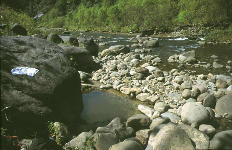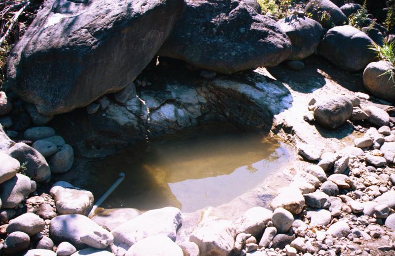 長流川の河原にある。階段を降りて河原に出ると、左右に1つづつ湯船がある。 脱衣場などはない。ちょうどチャリダー2名が上流の湯船に、オフライダー1名 が下流の湯船に浸かっていたので、私は下流(左側)の湯船に浸かった。 下流の湯船には湯を引いているパイプがあり、ネジ式の蓋がしてある。ぬるい 時は蓋を緩めればパイプから湯が出てくる仕組み。ただし、熱いので注意。 逆に熱いときは川の水を入れればよろし。増水時は湯船が水没します。またそ ういう時は危険なので無理して入るのはやめましょう。 |