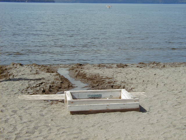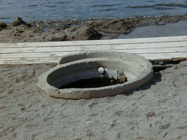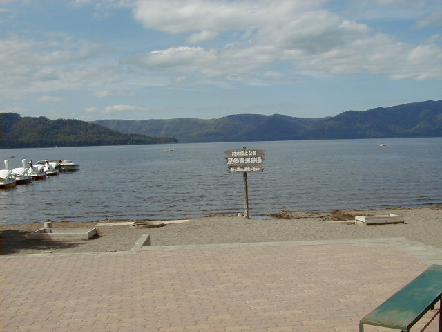 昼間に訪れた時は、観光客が多くて入浴できる雰囲気ではなかったので、 日没後に再度訪れて入浴した。 湖に向かって右側の木枠には既に誰かが入っていた。(男女の声が聞こえた) 湖に向かって左側の木枠に入湯したのだが、湯が地面(砂)から滲み出てる 様な感じで非常に熱い。さらに湯の深さが30cm位しかなかったので上半身 は湯に浸かれない。9月とは言え、北海道であるので流石に裸だとちょっと 肌寒い。湯をすくって肩にかけたりしながら入浴した。 もしかすると、木枠内の砂を掘り出せばよかったのかも。 |