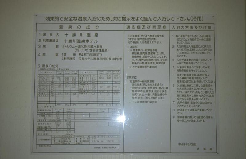 入口の右側にある自動販売機で入浴券を買う。そのまま奥に進むと浴室が ある。誰も入浴しておらず一人だった。左右に洗い場、右奥に内湯、左側 に寝湯、左奥に打たせ湯、打たせ湯の左側に露天へと通じる通路がある。 露天からは十勝川や十勝大橋が見える。十勝川の河原辺りが一面緑色をし ており、その先に見える十勝大橋とても良い眺めだった。 湯は茶褐色でちょっとぬるっとした感じ。見た目は汚そうに見えるが、こ の湯が世界的にも珍しい美人の湯(モール湯)であり、肌が滑らかになった 様な気がする。 |