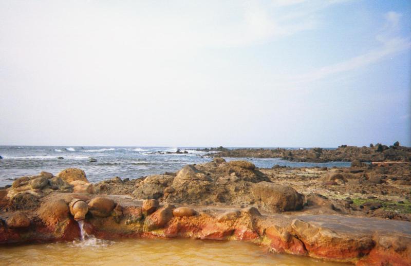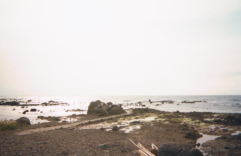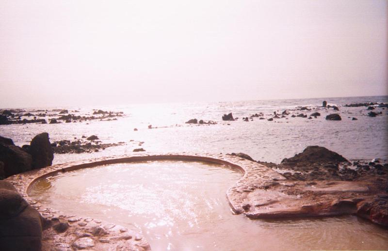 まずは内湯へ。なかなか広い脱衣場、湯船も広いしカランもある。お湯は鉄が 錆びた様な色と匂。このような色、匂いの温泉は初めてだったので強烈である。 体を洗い、しばらく内湯に浸かる。内湯に沿って大行きな窓があるので、日本 海が見える。露天も見える。 露天は建物の外で、結構離れているので、一旦服を着てから露天へと向かう。 おじさんとおばさんがちょうど服を着ている所だった。建物(内湯)を見ると、 女湯の方は窓の下半分くらいが外からは見えない様になっていた。おじさん、 おばさんは出て行ったので一人で入浴する。ひょうたんの様な形をした露天風 呂の湯は内湯と同じ湯であるが、なんと言ってもロケーションがいい。手を伸 ばせば、そこは日本海なのだ。広大な日本海を眺めながらの入浴も格別である。 でも、海が荒れている日などはちょっと恐いと思った。 |
