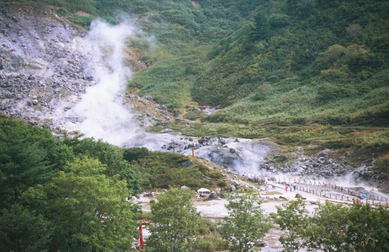 一旦上の駐車場を偵察してから下の駐車場へ行くが止める所がない。 ウロウロしていると係員に上の駐車場へ行けと言われる。上の駐車場もほぼ 一杯なので脇に止めて温泉まで歩いて行く。 右側に細長い内湯が、手前には蒸し風呂がある。この蒸し風呂は御所掛で見 たのと同じだ。柱に腰かけられる様になっていて、私を含め何人かが腰かけ ていた。内湯は成分の濃さ別に別れており、源泉100%の湯は、体にしみる。 飲湯用にコップがあり、1/4に薄めて飲むようにと注意書きが書いてあった。 宿の回りには散策路があり、ここを回るのも良いだろう。今度は泊まってみたい。 |