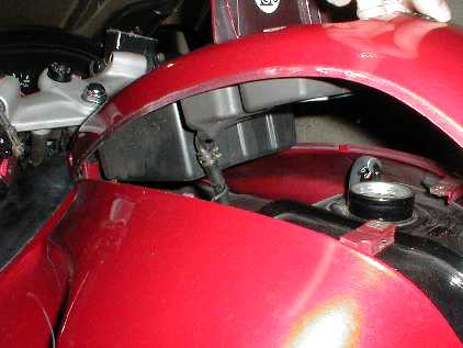 このパネルを外す。左右ある。右は、まずパネルにさらに付いている冷却水のリザーバのところのフタを取る。ねじ1本。ちょろい。