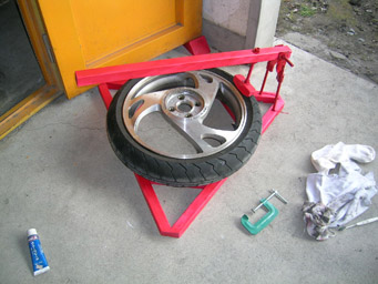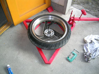折角Fホイールを外したので、こないだ作ったビードブレーカのテストをしてみた。