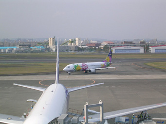 SNA機が駐まっていたけど、なんか遅れていて前の便の機体らしい。なんでも羽田が強風で発着が滞っているらしい。