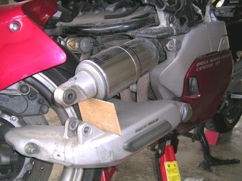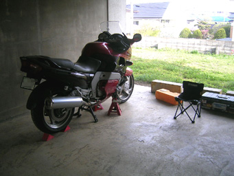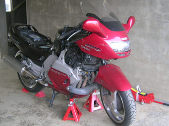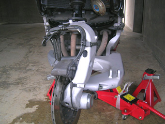今回はFスイングアームをフリーにしなくちゃなんないので、左右のジャッキポイントにちゃんとウマ掛けてみた。