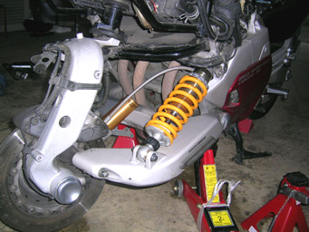 連休も最終日になって、来週末シェイクダウンに向けて突貫工事でFrontのOHLINSの取付けに取りかかった、のが、用を足し終わった16:00。