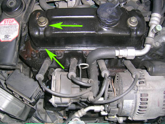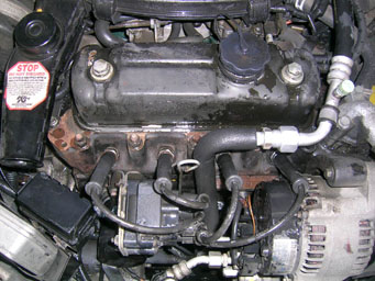 エンジンルームを見ると、エンジン全体がオイルでベットリしています。これじゃあ何処から漏れてるか判らないじゃないかあ。って、全体がベットリなら原因は一番上でしょう。ロッカーカバーのパッキンが怪しい。ロッカーカバー自体もベトベトなんで、上のスタッドボルト穴かな。