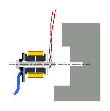 右の灰色の塊がエンジンブロック。黄色がステディロッドの端の断面。