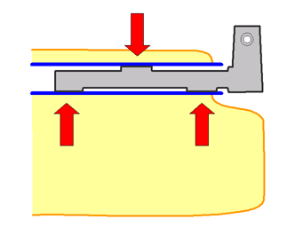 軸はプラスチック製でパイプに対しては少々きつく、パイプに嵌め込むと軸そのものがしなって3箇所の突起部の摩擦(赤矢印)で状態を保持する。てなところです。