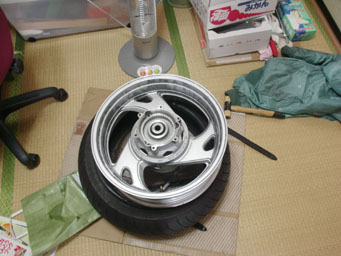 頭を冷して正攻法で外しました。ビードをちゃんと低いところに落としておくことと、リムプロテクターは最初から3つ並べてタイヤレバーは最初から3本(2本)ともセットしておくこと。これがミソですな。