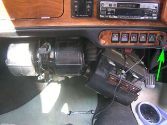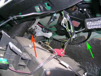 赤い矢印が冷却水のパイプに付いている開閉バルブ本体。緑の矢印のワイヤが、前の写真のツマミからつながっていて、これでバルブを開閉するわけだな。