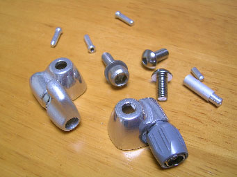 でもコレ、よく出来てます。右用はクイックアジャスターになってるし、左用もアジャスタスクリュの穴はアルミにネジ切っただけじゃなくて内側にスチールのコイルが嵌まっていて磨耗で山が潰れないように補強されていたり、レースで絶対に壊れない、そして勝つための工夫があれこれ。(穴の縁にバリが見えてるのは御愛嬌)