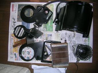 ということで手をつけたのはヒーターです。吹き出しの切換えが不具合で、デフロスタにしても足元に漏れちゃって全然曇りが取れないのです。その原因は、パッキンになってる内部のスポンジが腐って粉になって室内に噴き出しちゃったからのね。今でもファンを回すと彼方此方からスポンジの粉が噴出してきます。これはたまらん。