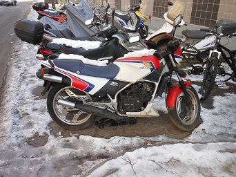 なんか古そうだなあ。どっかで見たようなカウルだよなあ(VTと一緒)、2stだ