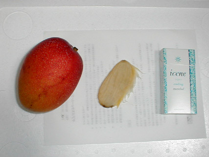 ![]() 左が実。中央が種。見りゃわかるね。 右は我社の割と新製品です。 種は結構でかいですね。そして平べったい。 |