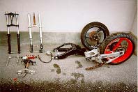 もちろん、ステムベアリングから、スイングアームのシャフトから、Rサスのリンクやら、台座位置やら、オフセットスプロケットやらなんやら、面倒くさいことが沢山あるわけです。第一、剛性の高い足回りを入れると、ノーマルのRZRフレームではまともに走らなくなるでしょう。とは識者一般の弁。 パーツの確保まあ面倒なことは試行錯誤でいいかななんて適当に考えつつ、めぼしいパーツを物色。ここで登場するのは当然中古バイク雑誌の個人パーツ売買のページ。さくっと(全然そうでもない)TZRの足回りをゲット。結局小僧2人組から91倒立と89リヤ周り、抱き合わせで91リヤ周りを全部で6万で購入。 でもここで既に問題が。「91の前輪が(安く)見つからん!」ていうか、フォークと三つ又だけでは全然だめだあぁぁぁ! ということで、横浜市の外れの某所(有名かも)のジャンク屋でホイールを探すも見つからず。キャリパーもないのだ。話にならん。 弱いのでここでさっくり方針変更。「ノーマルできっちり直しちゃろう」 すると必要なのはRZRフォーク。潰れたRZRはジャンク屋にいくらでもある!。でも大概前方から潰れているので、フロントの綺麗なやつはなかなかないなあ。 あ、あんなところに赤シート(1AR)が埋まってる!「おーいおっちゃん。あれのフォークくれ。」「2万。」 がーんちと高けーと思いつつも値切らずに買ってしまった。足元見られたー。 新品純正パーツの確保リヤ周りはもともとリンク部が渋くなって、ひどい状態だったのでこれを機にオーバーホール。リンク周りの消耗品がいるね。それから、フロントフェンダーはまだ新品が手に入るね。あとは、またアクセルワイヤーが折れちゃってらー。ってことで、こいつらを購入。あと細かい消耗部品はバイク用品屋で売ってる汎用品でいいや。フロントカウルとメーターステーはもう手に入らん。中古だってレア物で高いぞ。なんたってRRなんて珍獣の化石みたいなもんだ。 じゃあー、お約束だ。自分で直してしまえーー! というわけで、カウル補修はカウルの部へ。 メーターステーは外からは見えないし、安全に関係ない部品だしってことで、レンチで挟んで「ぬおーりゃぁあー」と一発、手曲げ。おわり。細かいところは地面に叩き付けたりして直した。本当。 |