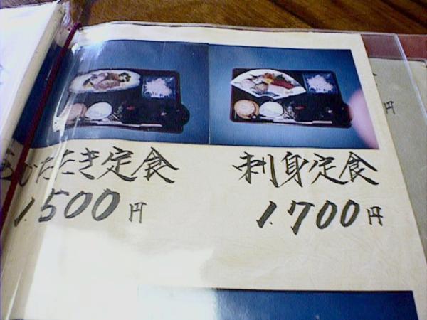 ちと高いんすよ。でも刺身定食のほうがうまいよん。200円の差は我慢すべし。 ちなみに何頼んでもごはんは自分でよそうパターンで、お代わりは自由! 大根シ ラス和えとかおしんことかうまいので、食うつもりならいくらでも飯が進む。な かなかいいよ。