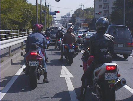 走ってるときバイク全部が見渡せるので気分ええし、信号が青に変わる直前にみ んながギアをがしゃんこと入れるのがなんとなくかっちょ良くもあり滑稽でもあ り。
