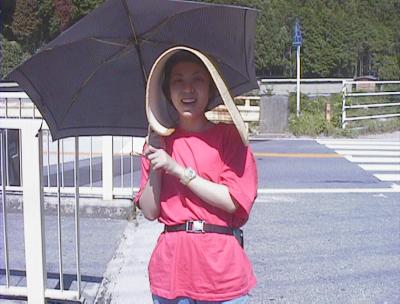 帽子かぶって雨傘さして竹ゴザかぶってウェストバッグ。